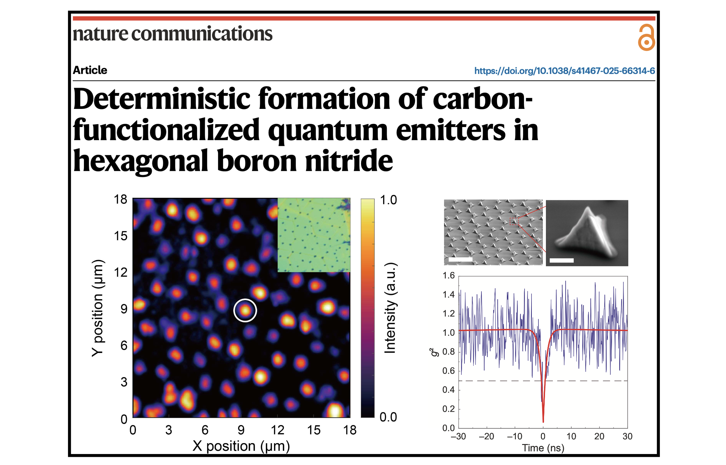 We are excited to share our recent Nature Communications paper (link to the paper), “Deterministic formation of carbon-functionalized quantum emitters in hexagonal boron nitride.” In this work, we demonstrate a simple and scalable nanoindentation-based approach to deterministically create high-quality single-photon emitters at predefined locations in hBN, with clear evidence that carbon incorporation is the microscopic origin of the emission. This method enables wafer-scale arrays of quantum emitters in a single fabrication step and provides a powerful platform for systematically engineering and understanding quantum emitters in 2D materials—opening new opportunities for integrated quantum photonics, sensing, and quantum information technologies.
